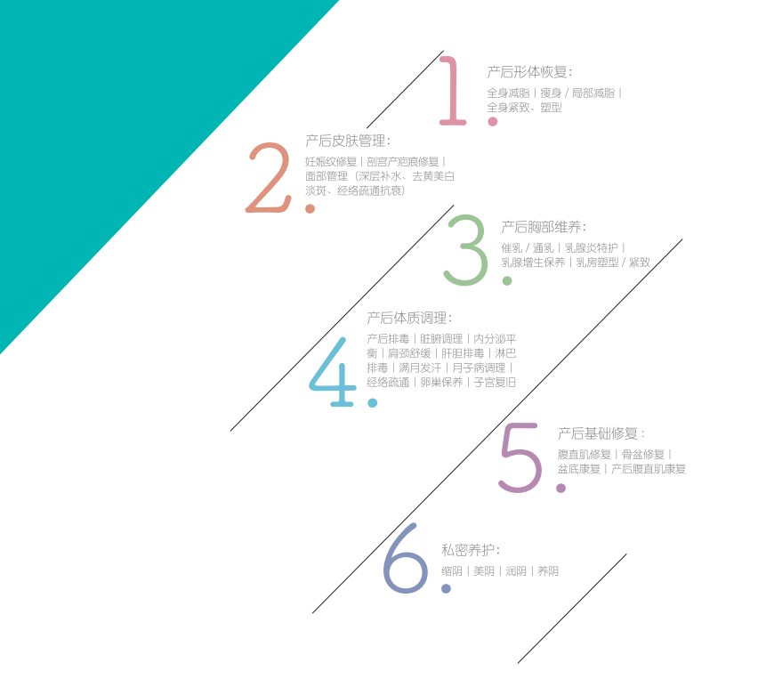 產(chǎn)后形體恢復(fù)丨產(chǎn)后皮膚管理丨產(chǎn)后胸部維養(yǎng)丨產(chǎn)后體質(zhì)調(diào)理丨產(chǎn)后基礎(chǔ)修復(fù)