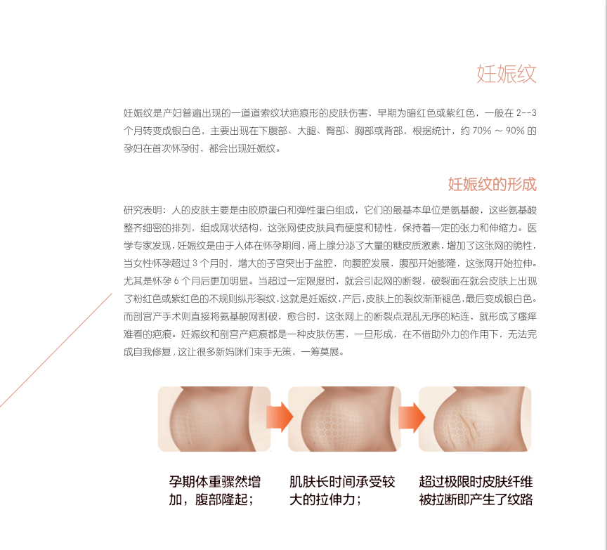 生育后的前兩年是修復(fù)妊娠紋的最佳時期,應(yīng)該在生育后第一時間進(jìn)行妊娠紋修復(fù)。充分借助身體自愈功能。就像傷口能自愈一樣,人體自身具有強(qiáng)大的自我修復(fù)能力。在生育后的第一年內(nèi),是人體自身對妊娠紋修復(fù)最強(qiáng)、最集中的階段,身體會自動調(diào)集膠原蛋白向妊娠紋區(qū)域補(bǔ)充,一些未完全斷裂彈性纖維能夠得到鏈接。在這個階段口服補(bǔ)充體內(nèi)膠原蛋白,外抹除妊娠紋霜促進(jìn)膠原蛋白和彈性蛋白的合成,用束腹帶包裹促進(jìn)愈合,可以起到事半功倍的效果。