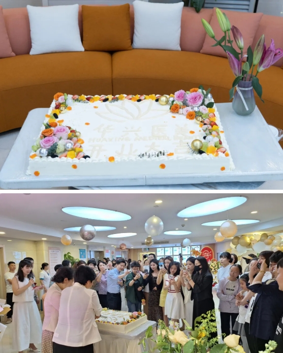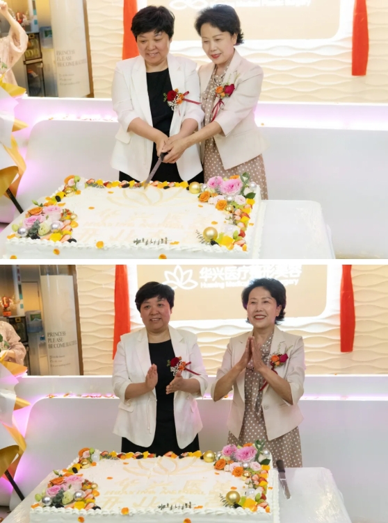 董院長與董會長攜手切下象征好運與希望的華興醫(yī)美慶典蛋糕,一刀落下寓錦繡前程,同心共筑美麗殿堂。同時,祝福華興醫(yī)美開業(yè)大吉。美,從華興開始!