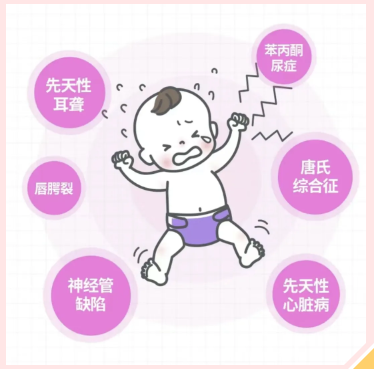 常見的出生缺陷包括先天性心臟病、唐氏綜合征(21-三體綜合征)、苯丙酮尿癥、先天性耳聾、唇腭裂、神經(jīng)管缺陷、無腦畸形、脊柱裂、腦積水等。